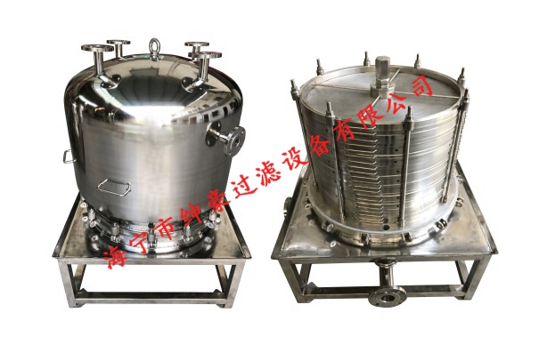 本机过滤装置是由多层重叠过滤网板和框组成,原液体经过加压进入桶体内,从框外边孔进入再经网板上的过滤介质,从网板多个小孔出来,合格液体排出口。滤材可选用聚丙烯滤膜、增强型滤膜、滤纸、滤布、不锈钢筛网、尼龙筛网、本机专用滤膜等,可根据用户选用合格的耗材。